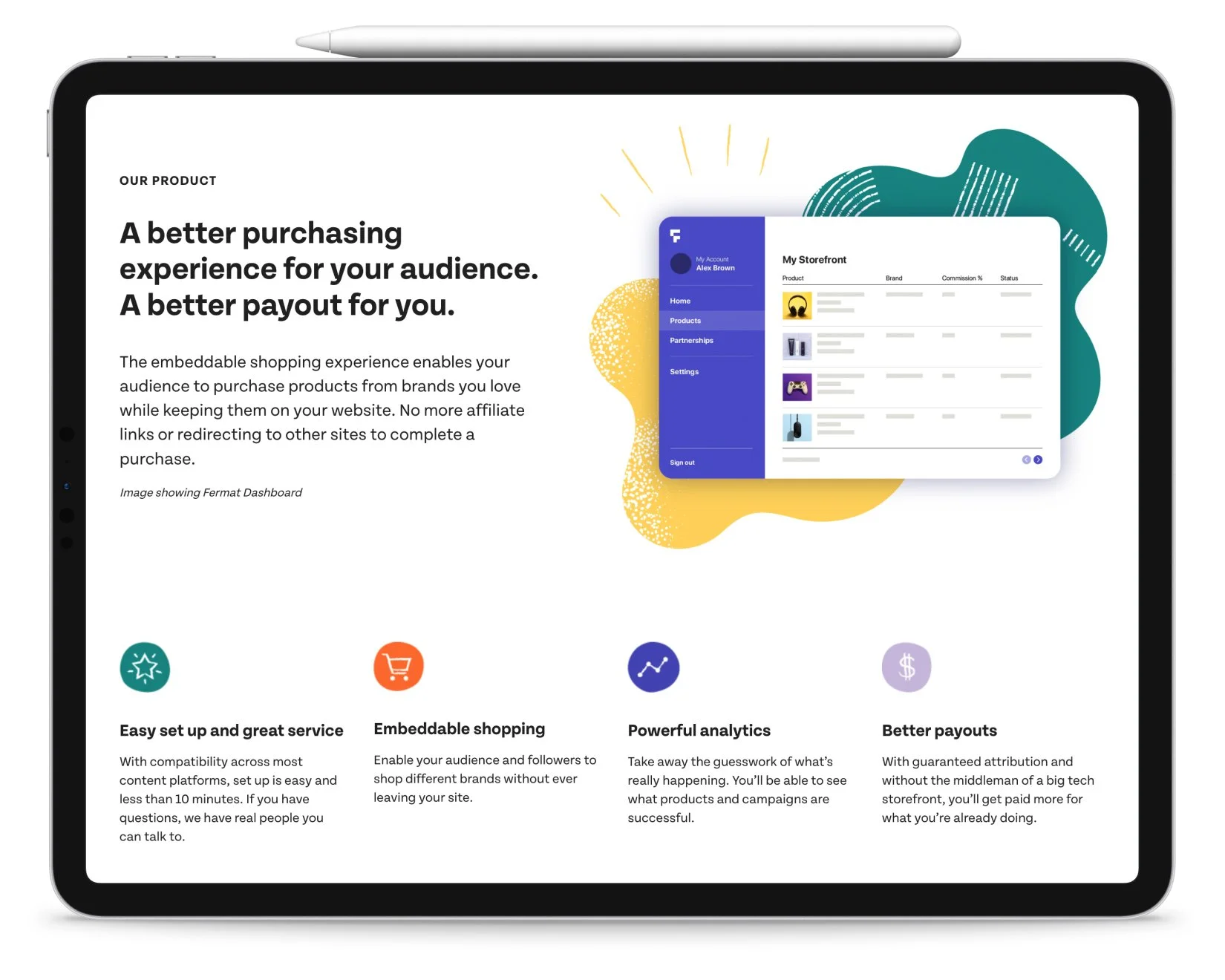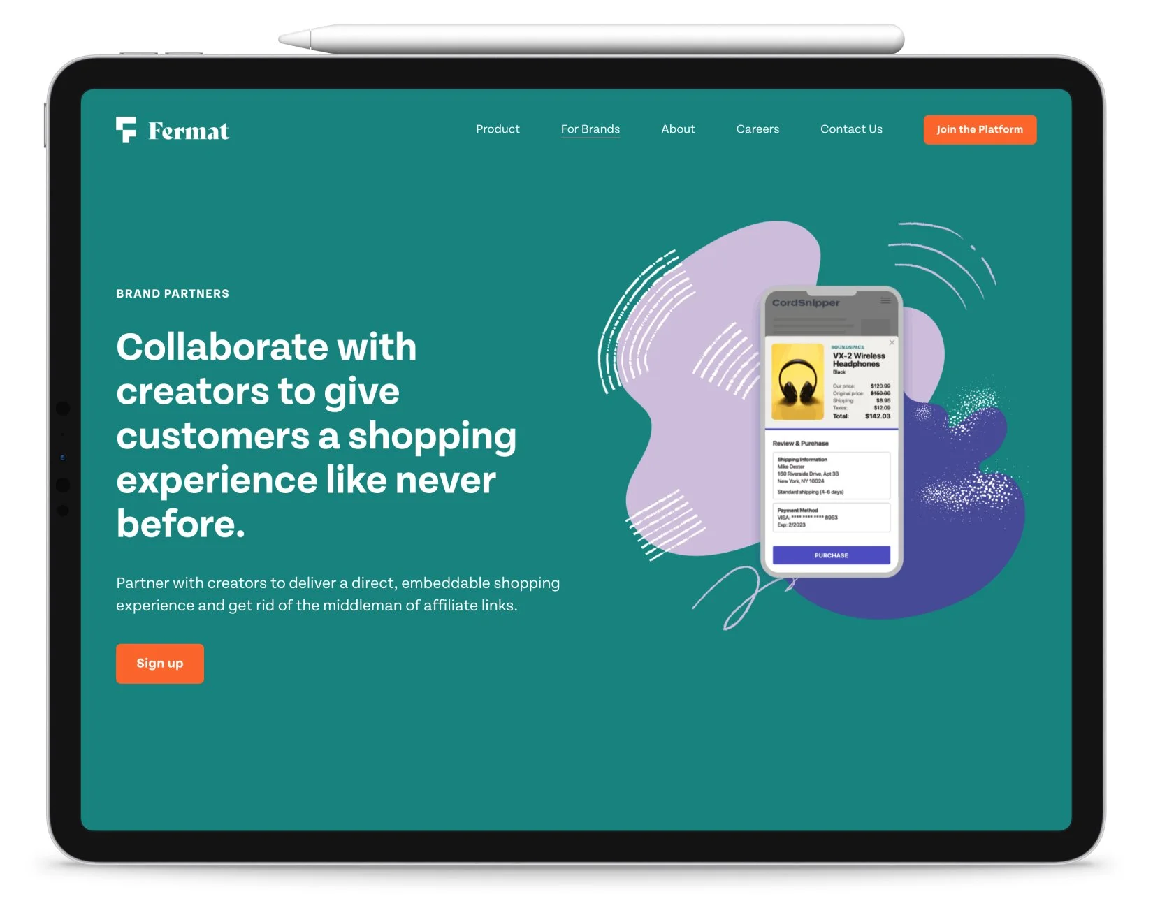 Fermat’s brand and website are designed to get creators excited and show them a new alternative to big tech. The website's goal was to get creators interested, but it far exceeded expectations. By the time creators contacted Fermat, they were already sold.