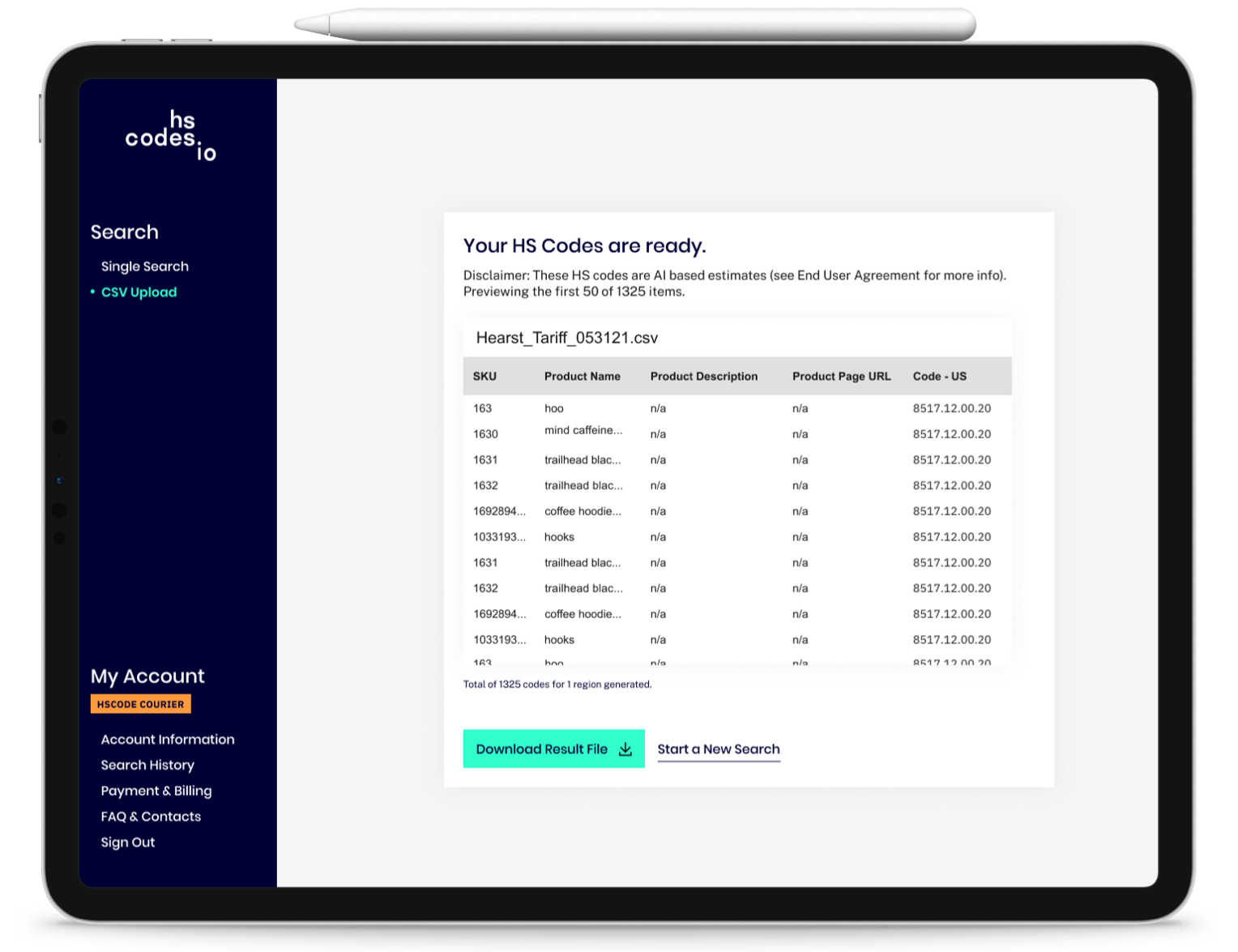 HSCodes.io is like bringing a metal detector to the haystack. With its intuitive interface, customers search their product description, and AI serves up the code they need. This takes the guesswork out of tariff codes so anyone can ship with confidence.